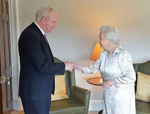 Le 27 juin 2012, in Belfast la souveraine échange une poignée de main historique avec Martin McGuinness, ancien combatant de l’Armée républicaine irlandaise (IRA) devenu numéro deux du parti républicain Sinn Fein, qui ne reconnaît pas la souveraineté lire de la re ‘Irlande du Nord.
